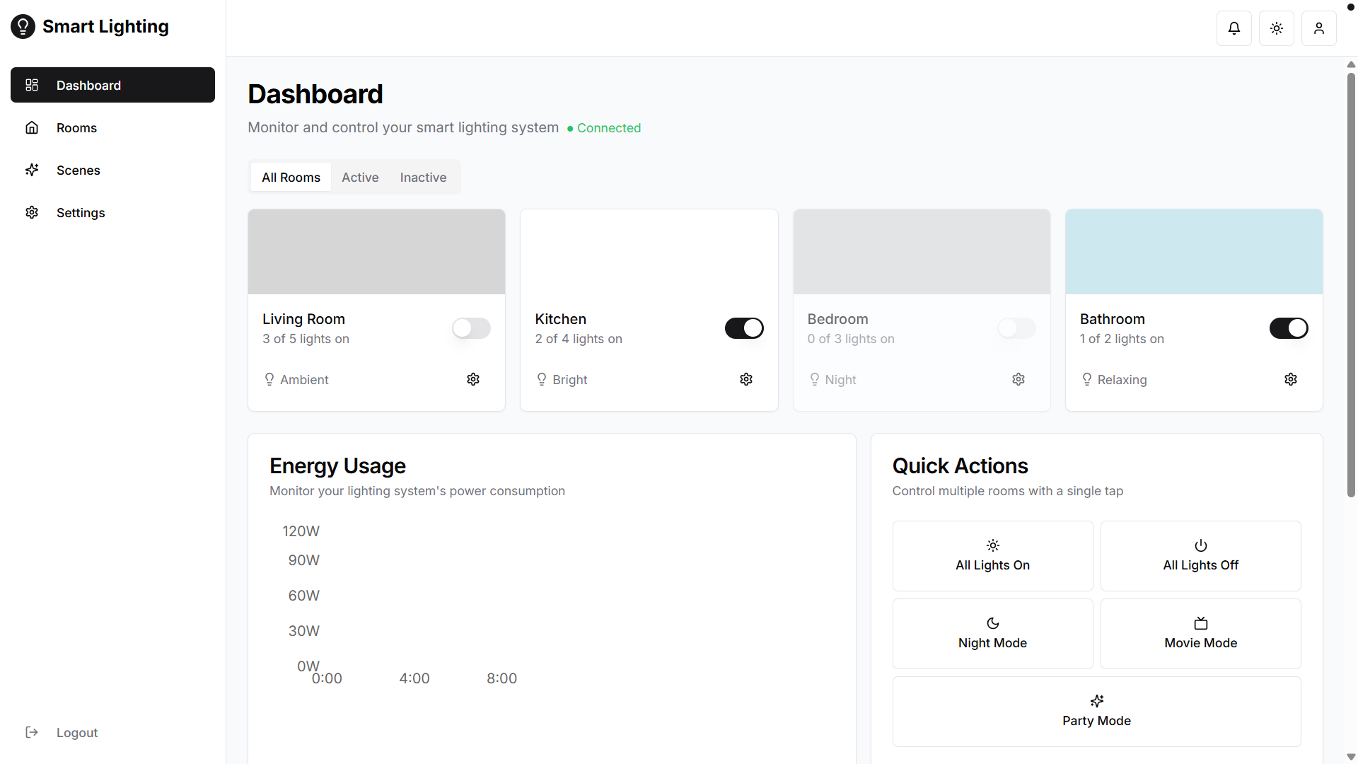 We developed an advanced IoT-powered Smart Home Lighting Solution that delivers dynamic lighting control through a custom-built ecosystem. By combining a programmable controller, a secure serverless backend, and an intuitive web-based interface, users can remotely manage lighting patterns, adjust brightness, and monitor real-time status across their home.